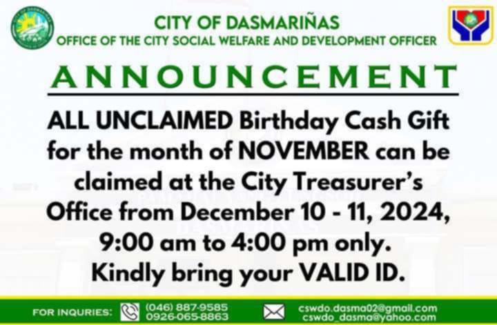 ANNOUNCEMENT! All unclaimed Birthday Cash gift for the month of November 2024 can be claimed at the City Treasurer's Office from December 10 - 11, 2024, 9:00AM to 4:00PM only. Kinldy bring your valid ID.